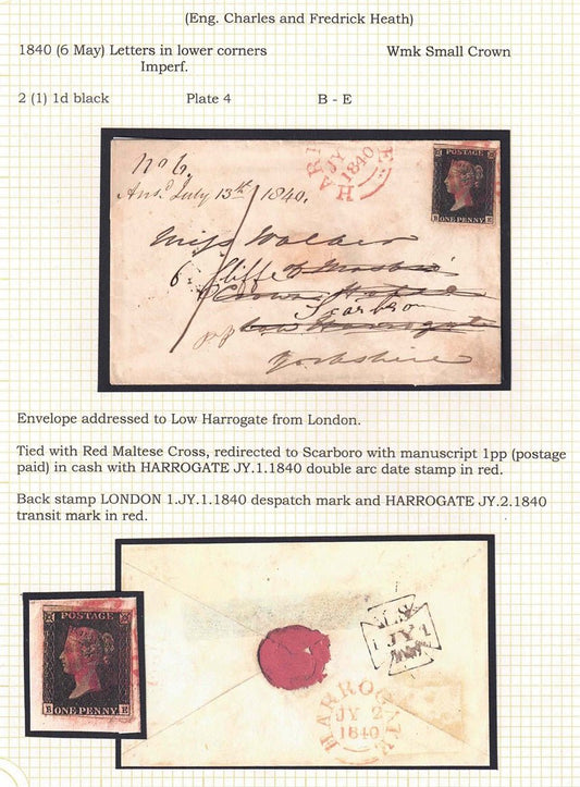 1840 Envelope from London to Low Harrogate 1d black Plate 4 clear margins Red MX re-directed
