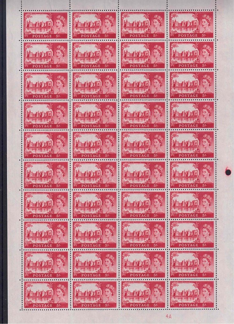 QEII 1968 SG 760 Castle 5/- Brownish red full sheet NHM not folded